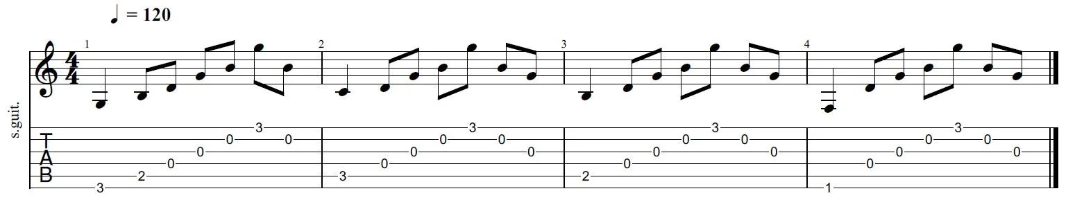 The other way that we will typically see slash chords, is with a moving bass idea. Here we can see that the chords are G, G/C, G/B, and then G/F. Part of the reason for this is to create a sound of a moving bass in our playing while we are playing a melody using the other strings.