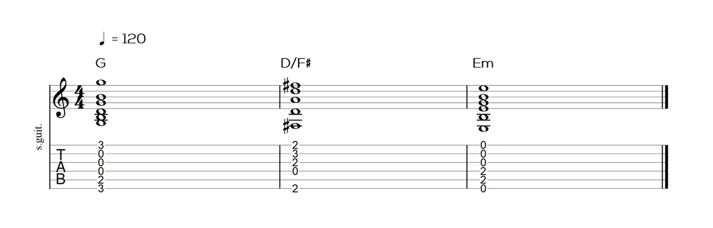 There’s two common ways on how we use slash chords. The first would be as a transition. Many times we will see a chord progression such as G, D/F#, then Em. If we examine the tablature, we will see that there is a descending scale fragment happening on the low E string.